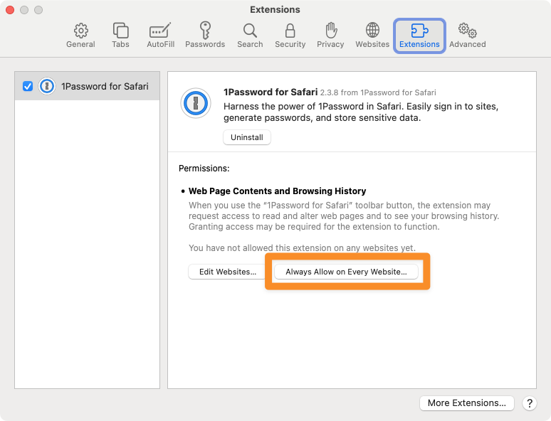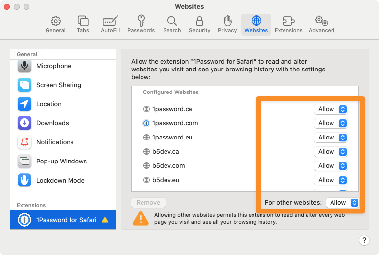 Remember to scroll down and choose "Allow" on every option in that list.Close the "1Password for Safari" window ā it doesn't need to be open for 1Password to work in Safari.