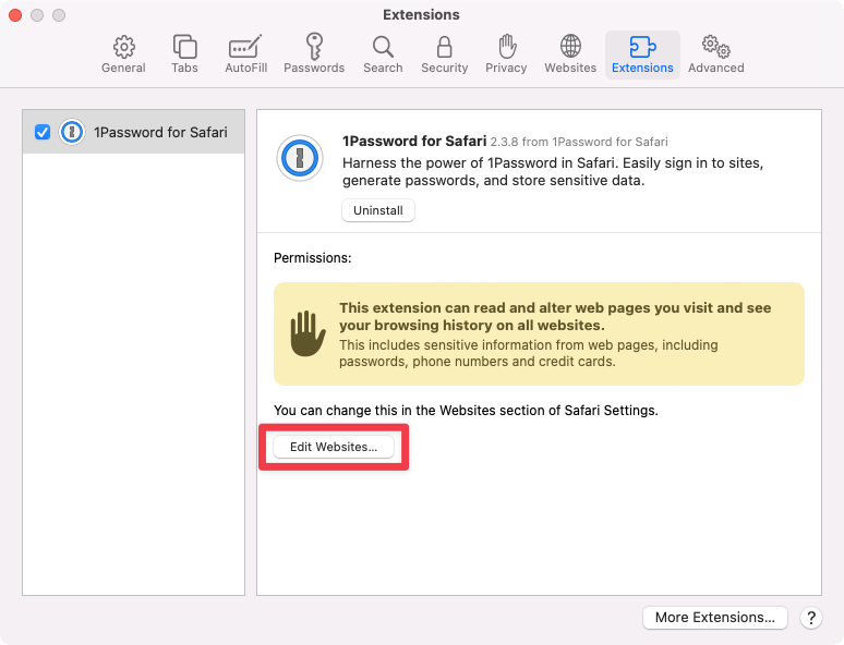 - On the Extensions tab, choose 1Password for Safari in the sidebar if necessary, then click "Edit Websites...", like this: