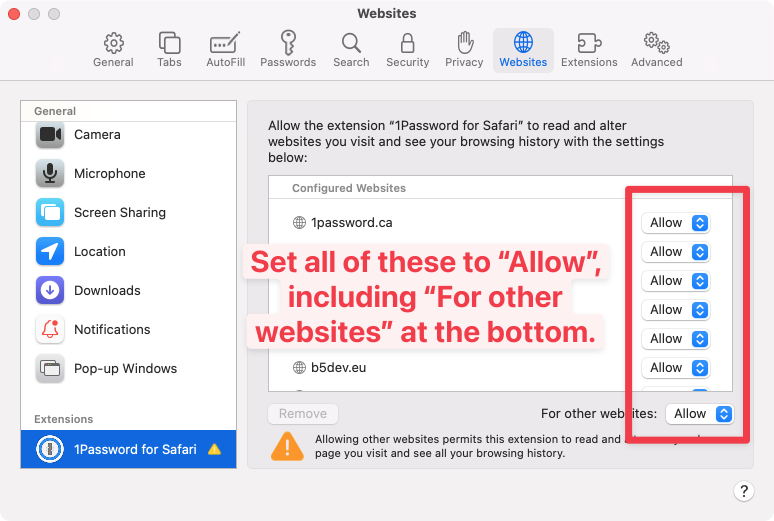 - On the page that appears, make sure that each line (including "For other websites" below the list) is set to "Allow", as in this example:
