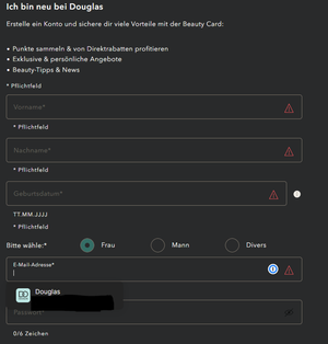 even though I've entered an identity with all the required information in 1pw it won't be offered when registering to new sites. (e.g. https://www.douglas.de/de/login)