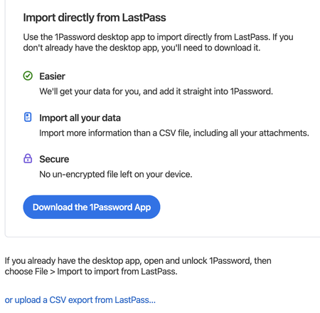 For some reason I cannot get an import from LastPass. It seems like I am going around in circles.. See attached. I already downloaded the desktop 1Password app for my mac. I keep getting t...
