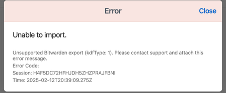 I'm sorry that you ran into an issue when importing your items from Bitwarden. From the error message, it looks like you might have your KDF algorithm in Bitwarden set to Argon2id.