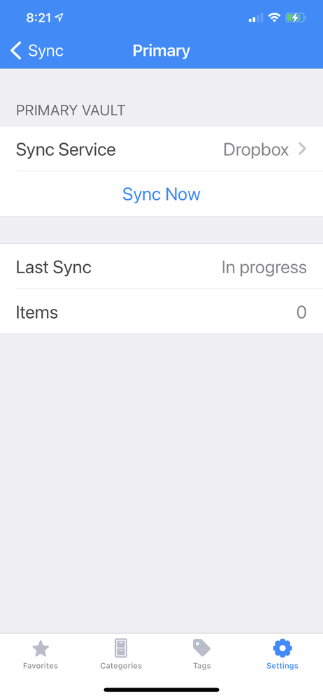 1PW sees the dropbox vault, I type in my password to unlock the vault. I see sync says saying with dropbox, and says sync in progress.