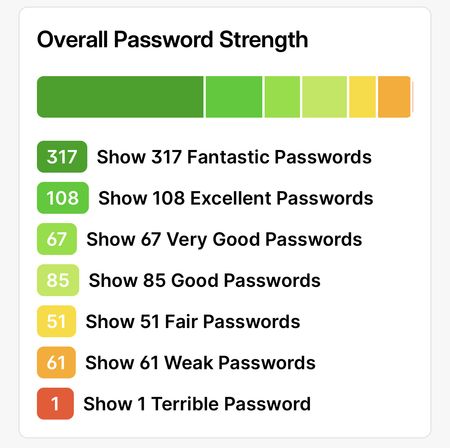 In the Overall Password Strength panel, it say's "Show xxx Fantastic/Excellent/Very Good etc. Passwords", however, despite the word "Show" suggesting that these lines should be an action, tapping on ...