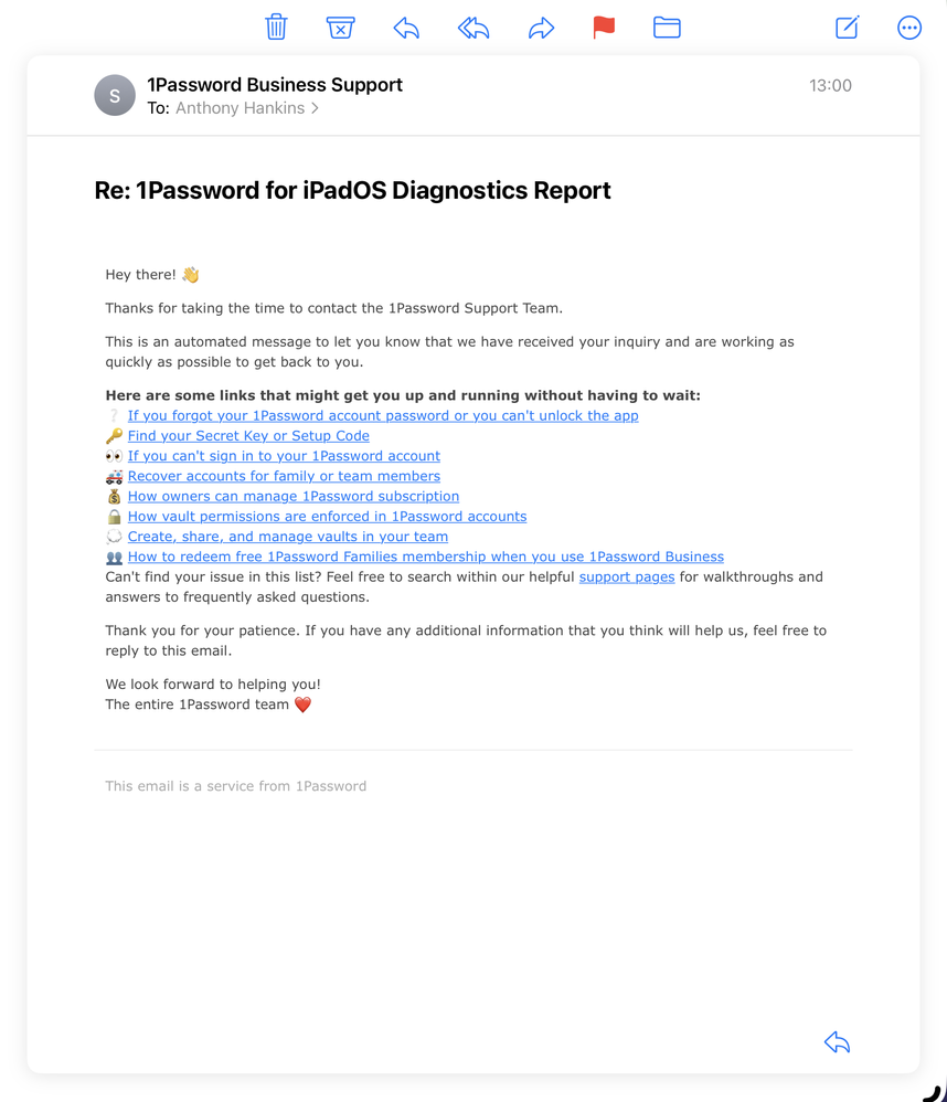 Attach the diagnostics to an email message addressed to support+forum@1password.com.