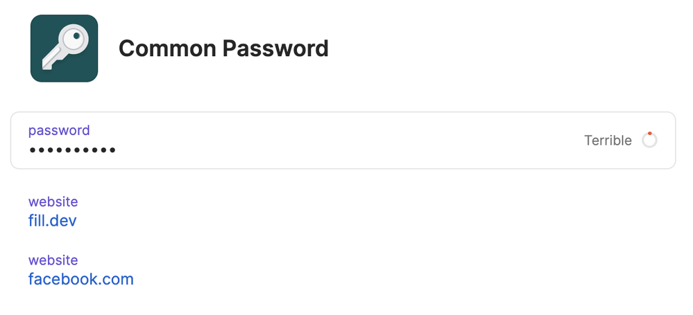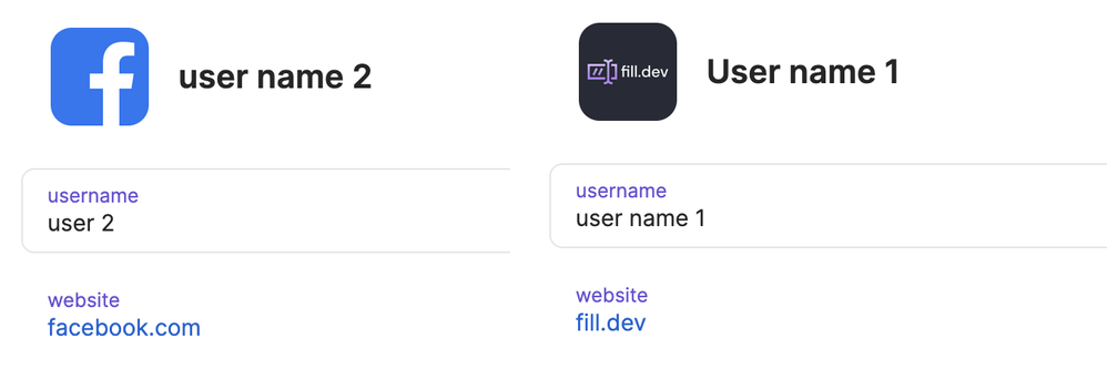 We can create a password item to store the password (only) and all related websites there (I am using fill.dev and facebook.com as the examples here):