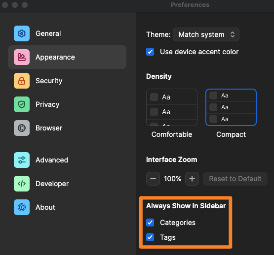 If you'd prefer to see only one or the other in the side bar of your 1Password 8 app on Mac, you can adjust this in your preferences: