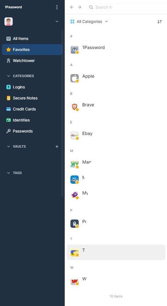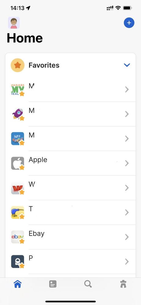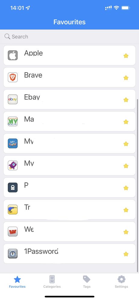 And this is the new 1Password 8 layout on the same device with the same 10 favourites - only 8 are now visible because of the large amount of screen bandwidth used by the header: