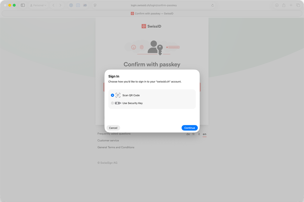 I'm sorry that you're running into issues when using passkeys. I see that the issue is occurring on swissid.ch in your screenshot and our development team is currently looking into an issue with passkeys on that specific website. Is this the only website where passkeys aren't working for you in Safari on your Mac? Or do they also not work on other websites?