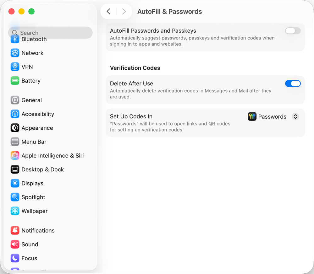 Also, to confirm, these are my system settings for AutoFill & Passwords: