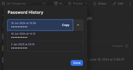 1 year agoThe latest password should the one displayed in the main 1Password interface not in the password history. Then the 2nd most recent would be the one at 15:38 and the 3rd would be the one at 14:12. I've seen this confuse folks before when they expect the one show in the window to include the one the that is displayed in the main UI.