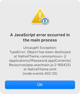 4 years agoI'm on the latest nightly 1Password Windows desktop build, and I've been running into an issue where any time the Windows colour scheme switches between light and dark, the 1Password desktop app shows an error message. Closing the error shows another identical one immediately afterwards, and then closing that one seems to be fine.