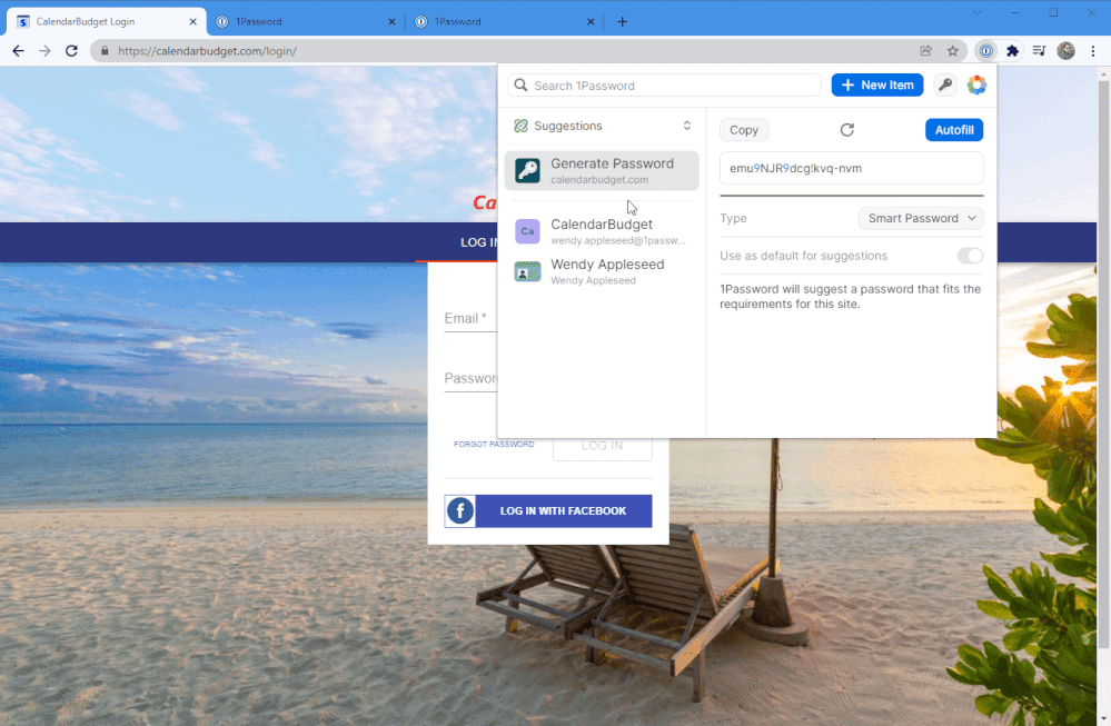 I never had this problem with the old "Classic" extension (either in Chrome or Firefox), but switched to the latest Chrome (and Firefox) extension just recently, and it doesn't work at https://calendarbudget.com/login/ . It offers the matching passcard, but when I try to use it, it only fills the email address, then something flashes by quickly (I think it's the website's sign up page), then I get a blank page. If I go back and try again, then 1Password offers me to generate a new password, but won't fill the one I already have saved. Of course I can copy the password manually, but this isn't ideal for a website I use at least once a day.