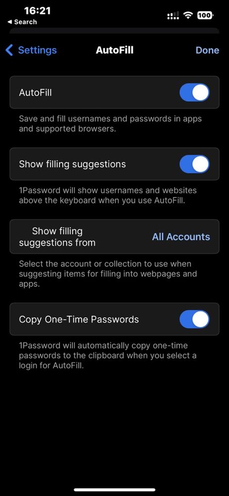 iOS > 1Password > Settings > Autofill