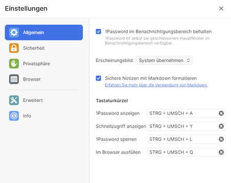 While setting the keyboard shortcuts 1password does not consider local settings. For example on a keyboard with German layout Y and Z are mixed compared to English layout. But if the keys CTRL+SHIFT+...