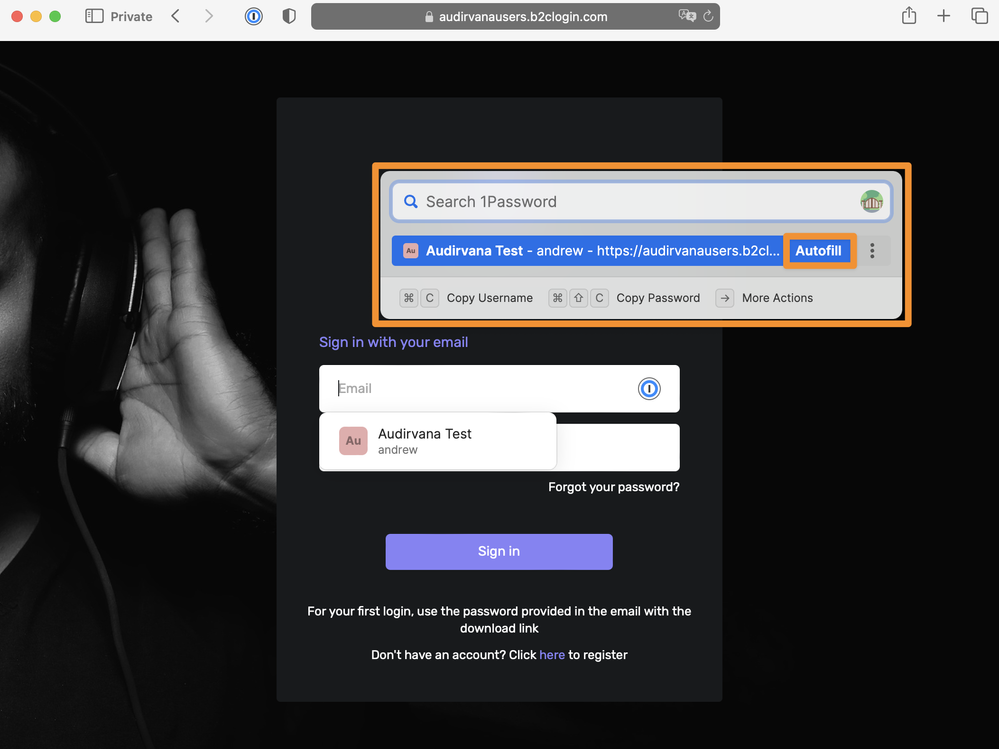 1Password works fine for the Audirvana website for me as well, however not for the window the app invokes in Safari.