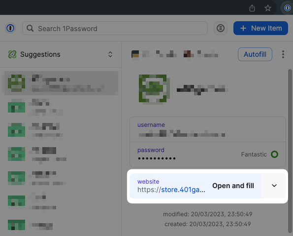 If you are already on the website in question 1Password will display 'Autofill' next to the item. If you are not already on the website then 1Password will display 'Open and Fill'.