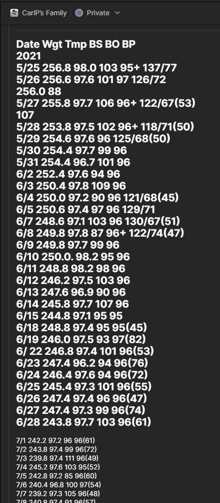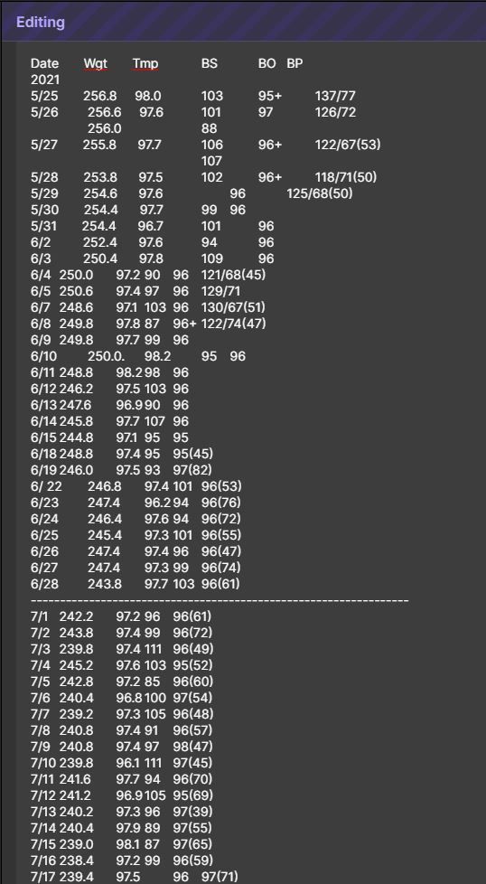 Sure. I have a note where I track health vitals. You can see where the columns headings and the numbers beneath are all collapsed together. Those were all tabbed out with the numbers neatly arranged under the headings pre-beta. Trying to tab these out now just results in the cursor jumping to the next field (Add more items, add Tag, etc.) Another strange change from the original note is the font change between the end of June and beginning of July.