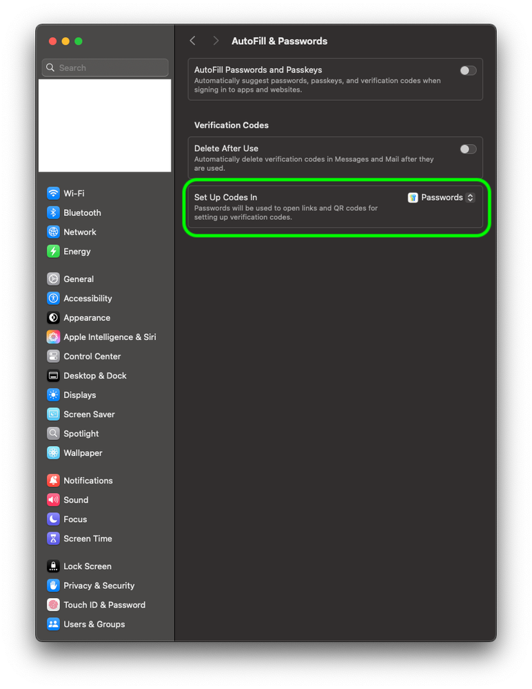 As you can see, “AutoFill Passwords and Passkeys” is turned off, but you cannot turn off “Set Up Codes In”; the only option is Apple's Passwords app. I think this issue would be resolved if 1Password were an option here.