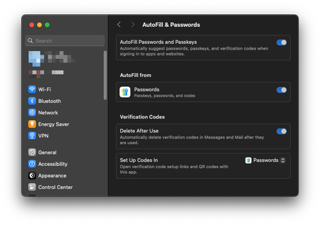 As you can see, “AutoFill Passwords and Passkeys” is turned off, but you cannot turn off “Set Up Codes In”; the only option is Apple's Passwords app. I think this issue would be resolved if 1Password were an option here.