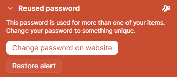 The issue is, when I go into "Show Ignored Alerts" and click on the same wifi password, the displayed warning changes. It now displays a "Reused password" alert. When I search for the password in 1Password the only account that comes up is this one, so the password has definitely not been reused. I have made sure the search was not limited to one collection. For several reasons, even before searching I found it highly unlikely that this password would have been listed elsewhere on my account.