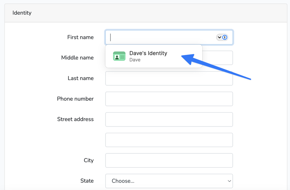 Welcome to 1Password! 1Password in the browser will suggest your identity when you click in the field so that you don't have to open the pop-up: