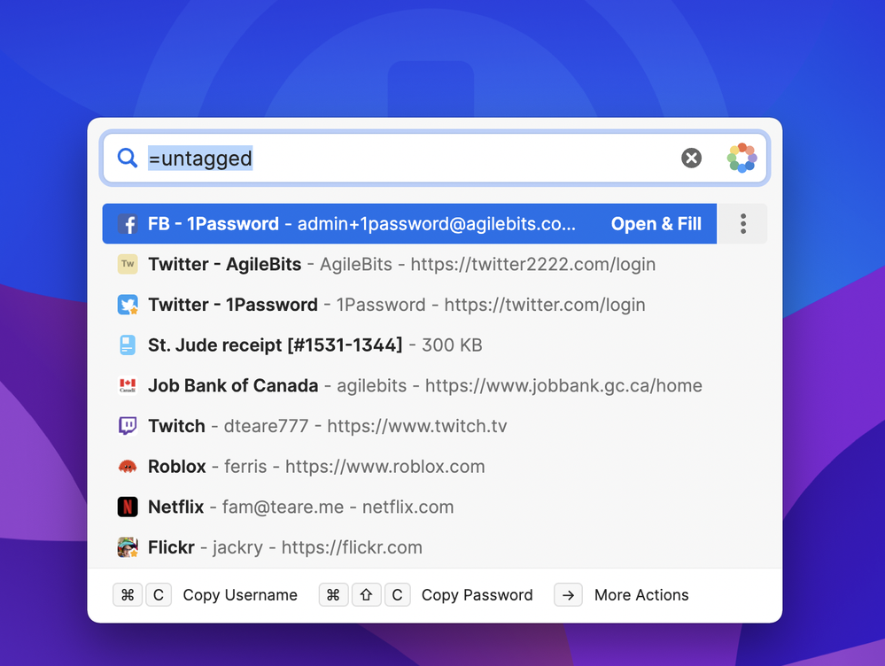 You can now search for untagged items by specifying =untagged to quickly find items you haven’t organized yet. This joins the =vault:$name, =tag:$name, =category:$name, and =favorite advanced search scopes.