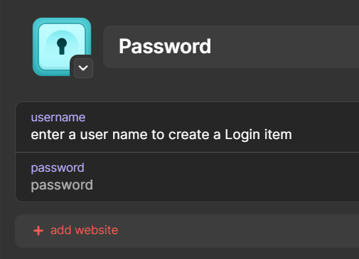 + New Item(Ctrl + N). The exception here as mentioned, is with the addition of both a username and password to a Password item, which then creates a Login item.Moving forward, I'd suggest if you'd like to save a Password item, only complete the password field. Then later, if you'd like to convert this to a Login item, completing the username field will move that item to the Login category.