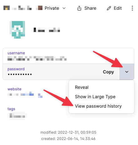 Thanks for these additional details. It sounds like this is a Login item in 1Password, is that correct? I'd also like to confirm that you're viewing password history via the menu beside the password field: