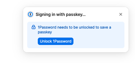I have a work website that requires a yubikey for auth. 1P is detecting this as supporting passkey, and prompting me to unlock 1Password. This prompt, even after being cancelled, does not allow Firef...
