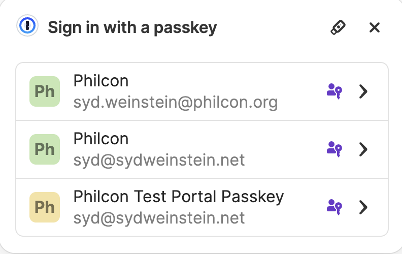 Thus when it suggests the passkey back, we have a hard time telling which one to choose. I often have had several "Philcon" passkeys with the same email address show up and I can't tell them apart.
