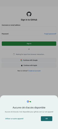 My passkeys for github.com works fine on desktop (Chrome, Firefox, Brave) and worked fine on Android 16 on my Pixel 8 Pro for a long while, but today I noticed that it doesn't work anymore. When my Android is asked for a passkey it will show the passkey popup with Google as provider and "No passkeys available for github.com".