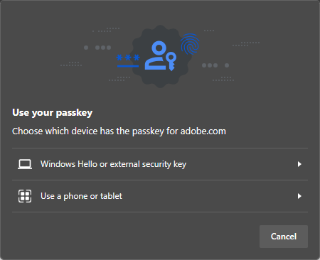 adobe.com - I entered my email address, took the option 'Use another method to receive the code' and then chose 'Sign in with passkey'. Scan the QR code and authorise with 1Password on my phone. I was then logged in to adobe.com.