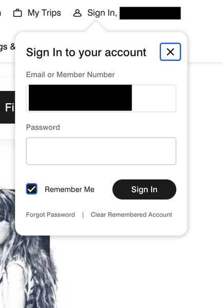 Marriott.com's login page opens a small pop-up widget. When I try to autofill my password from 1P, the box disappears.