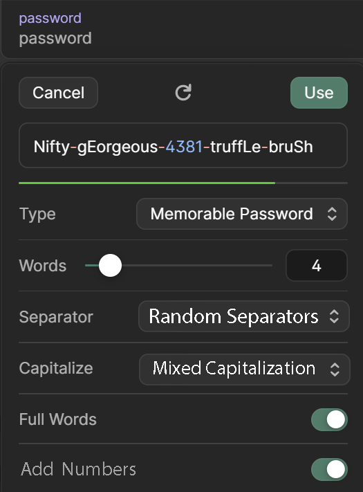 Would be great if there were an option "Random Separators" which use a random of "-_.:#@!?" if you need to really type them in a console in a bad situation like on a rack or something it is really helpful.