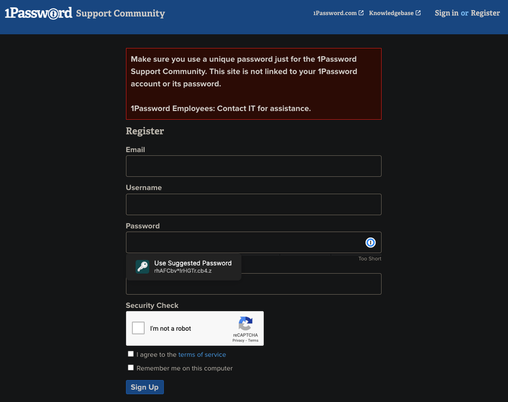With the example of signing up for this community (welcome!), I recommend using the 1Password browser extension. It can automatically offer password suggestions, and these can be customized in the browser extension's password generator itself: