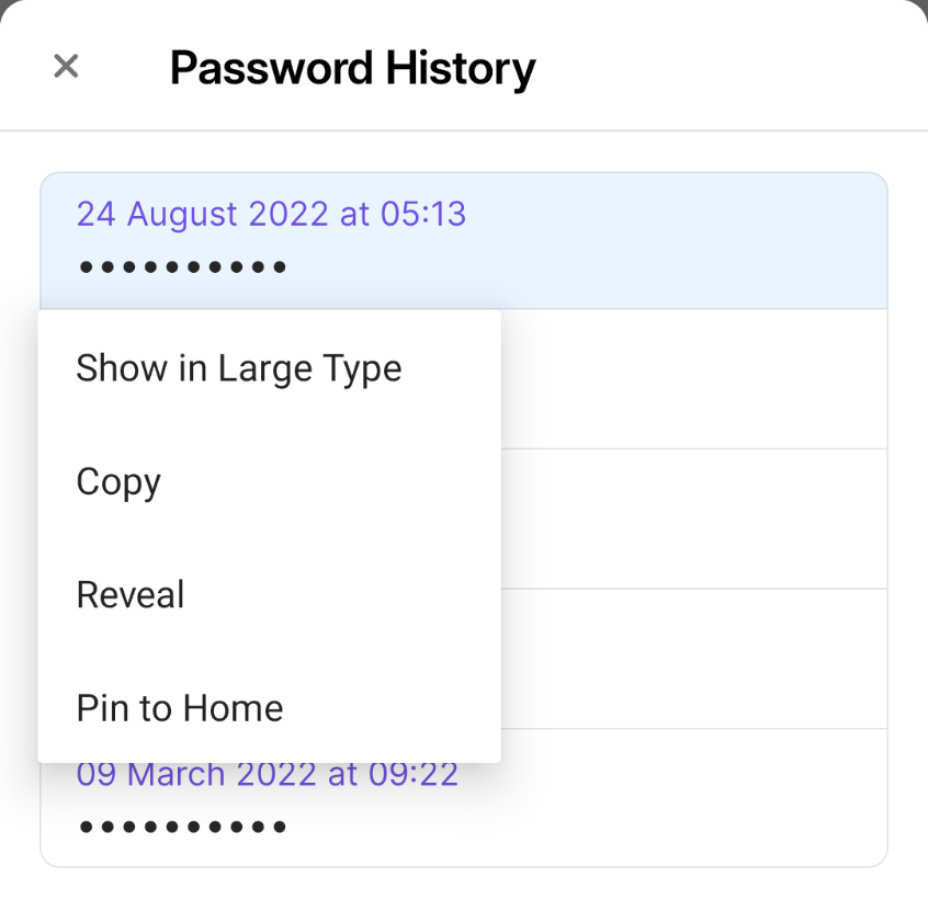 2. Tap one of the passwords and choose Reveal to see the previously used password: