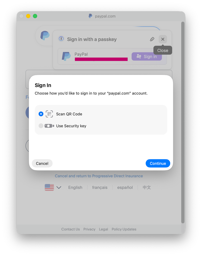 I'm making a purchase through another website and it opens a PayPal popup window to complete the purchase. The passkey prompt appears, and then is replaced by the Safari Passkey prompt. If I dismiss the Safari prompt, the 1Password prompt doesn't do anything.