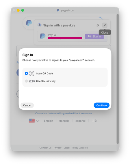 When I log into PayPal.com, my passkey works as expected. But... I'm making a purchase through another website and it opens a PayPal popup window to complete the purchase. The passkey prompt appears...