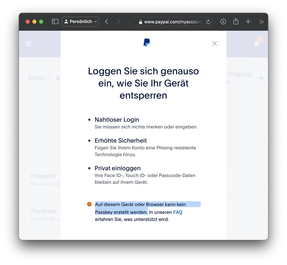 After I easily stored a passkey from Amazon in 1Password, I wanted to create one at PayPal. Unfortunately this is impossible, the PayPal page gives the error "No passkey can be created on this device or browser" and refers to FAQ.