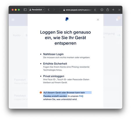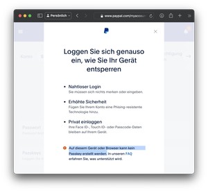 After I easily stored a passkey from Amazon in 1Password, I wanted to create one at PayPal. Unfortunately this is impossible, the PayPal page gives the error "No passkey can be created on this device...