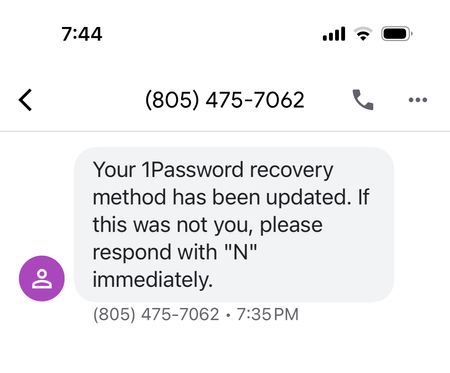 I received two text messages this week within 10 minutes of each other, both from an 805 area code. They were identical: "Your 1Password recovery method has been updated. If this was not you, please ...