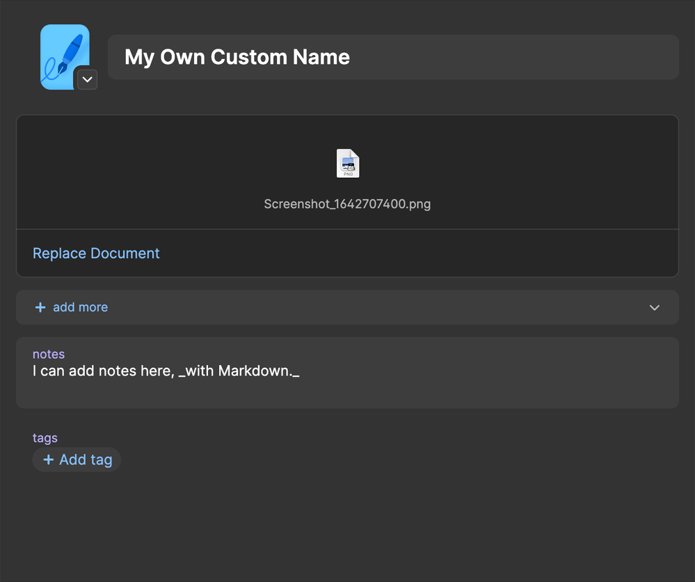 I also want to point out that Document items include a notes field which include the same features (Markdown, namely) as a Secure Note.