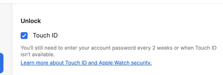 Security requires I enter my master password once every two weeks. I have Touch ID. Please remove that requirement, unless you are concerned that I will forget my master password, which is possible! ...