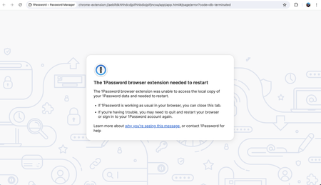 Here is a guide on how you can prevent the particular error in your screenshot from happening: If you see "The 1Password browser extension needed to restart".