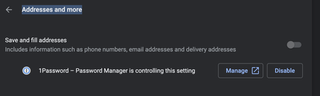 I enjoy using chromes built in Auto-fill>> Addresses and more for URLs and other information on pages I use a lot. But now I notice 1password has disabled this function so I cannot use it. I can disa...
