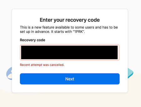 I was adding two 2fa security keys to my account. 1Password thought it went well, the first "succeeded" and was listed on the security page, but for some reason the key was never written to on Windows because the security popup. Now I am stuck without the ability to use my recovery code. I tried using that immediately after this happened (upon learning I had no 2fa key) and was told it was too soon to use it! Then I waited an hour and was told to forget about it.