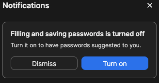 Can you please make it so this badge/notification isn't showing? Filling and saving passwords is turned off, I want it off on the one computer I use. I don't need a reminder EVERY TIME I log into 1Password. I select "Dismiss" and the next day it's there again. So annoying.