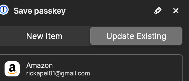 I automatically shut down down the auto pw on those logins, but suspect I need to do it for Amazon(even though it is a 2 screen login) as I suspect that in their login logic they are automatically offering up a passkey if the login is driven through using the standard way (which 1pw is doing with the auto login option set) and then just blindly offering up a new passkey.