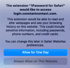 I'm trying to login to my Constant Contact account. When I try to fill with Safari extension, I get the dreaded "the extension "1Password for Safari" would like to access login.constantcontact.com" m...